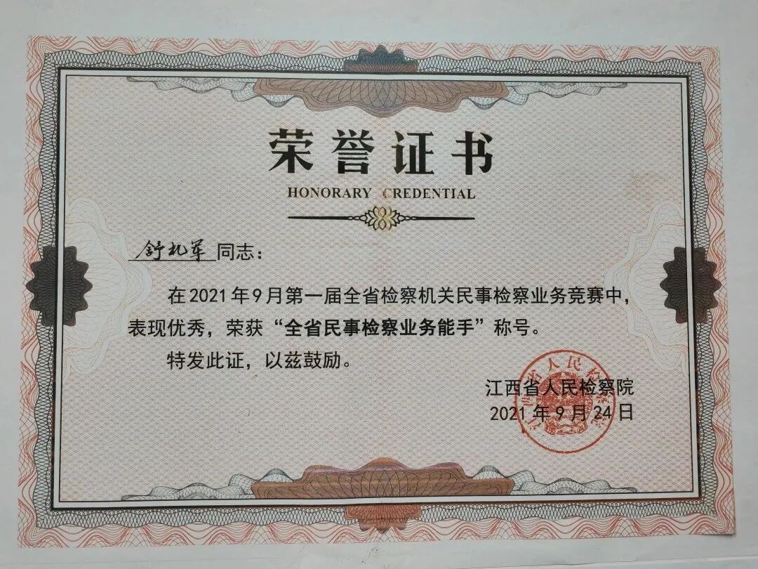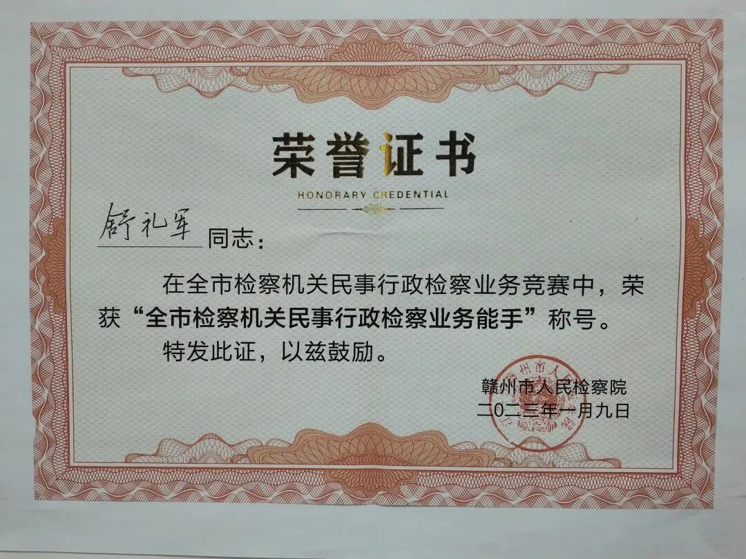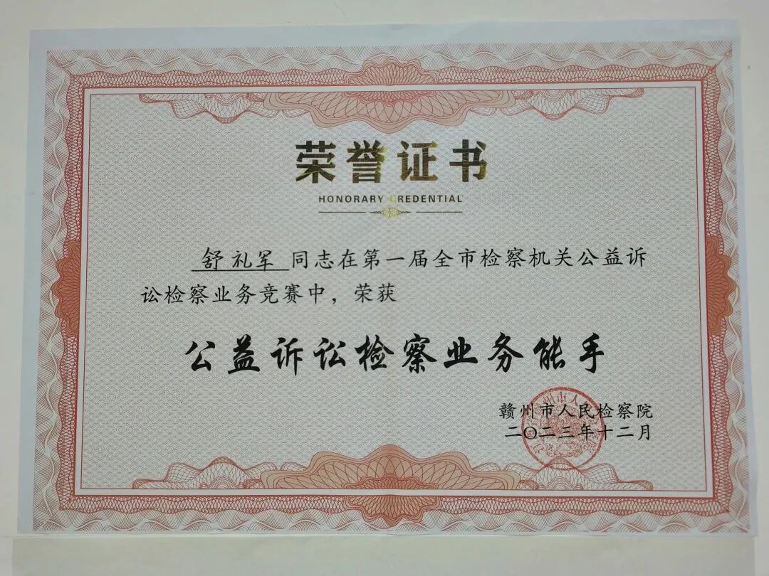 12月14日至15日,赣州市检察院举办全市检察机关首届公益诉讼检察业务竞赛,全市两级检察院33名业务骨干同台竞技,经过初赛案件审查与法律文书制作、决赛业务答辩和模拟法庭辩论,于都县检察院舒礼军同志荣获“公益诉讼检察业务能手”称号。