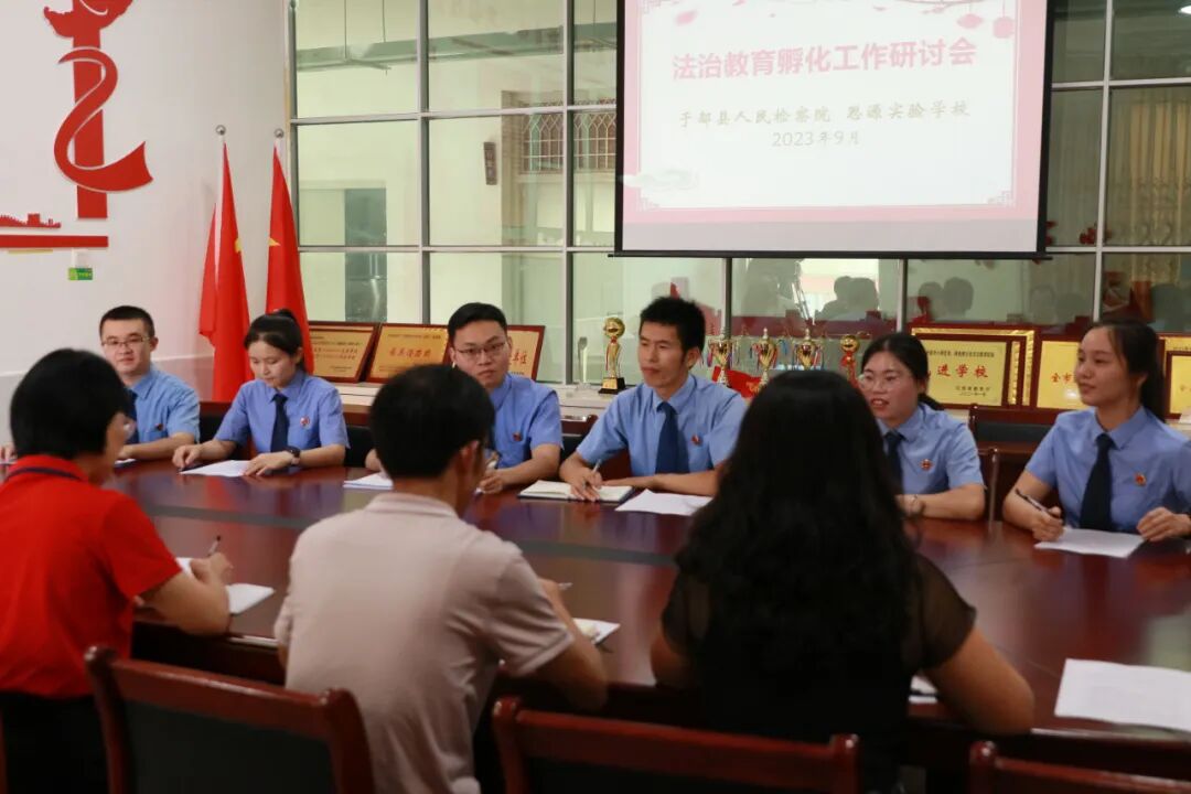 9月18日下午,于都县检察院法治教研小组成员来到于都县思源实验学校,共同研讨新学期法治教育课程计划及内容。法治教研小组是法治教育孵化基地三大活动小组之一,小组成员由于都县检察院干警和思源学校教师共同组成,主要负责法治教育工作,培养学生的法治意识和习惯养成。研讨中,各位小组成员各抒己见,对新学期法治教学课程《面对欺凌 勇敢说“不”》提出修改意见,思源学校老师从教学角度针对教学内容、表达方式和教学效果等方面提出了自己的意见建议,得到与会者的充分肯定并对课程进行完善。下午16时,于都县检察院法治教研小组成员在思源实验学校录播教室给8年级11班的学生上《面对欺凌 勇敢说“不”》为主题的法治课,该校其他33个班的学生在教室里观看直播。